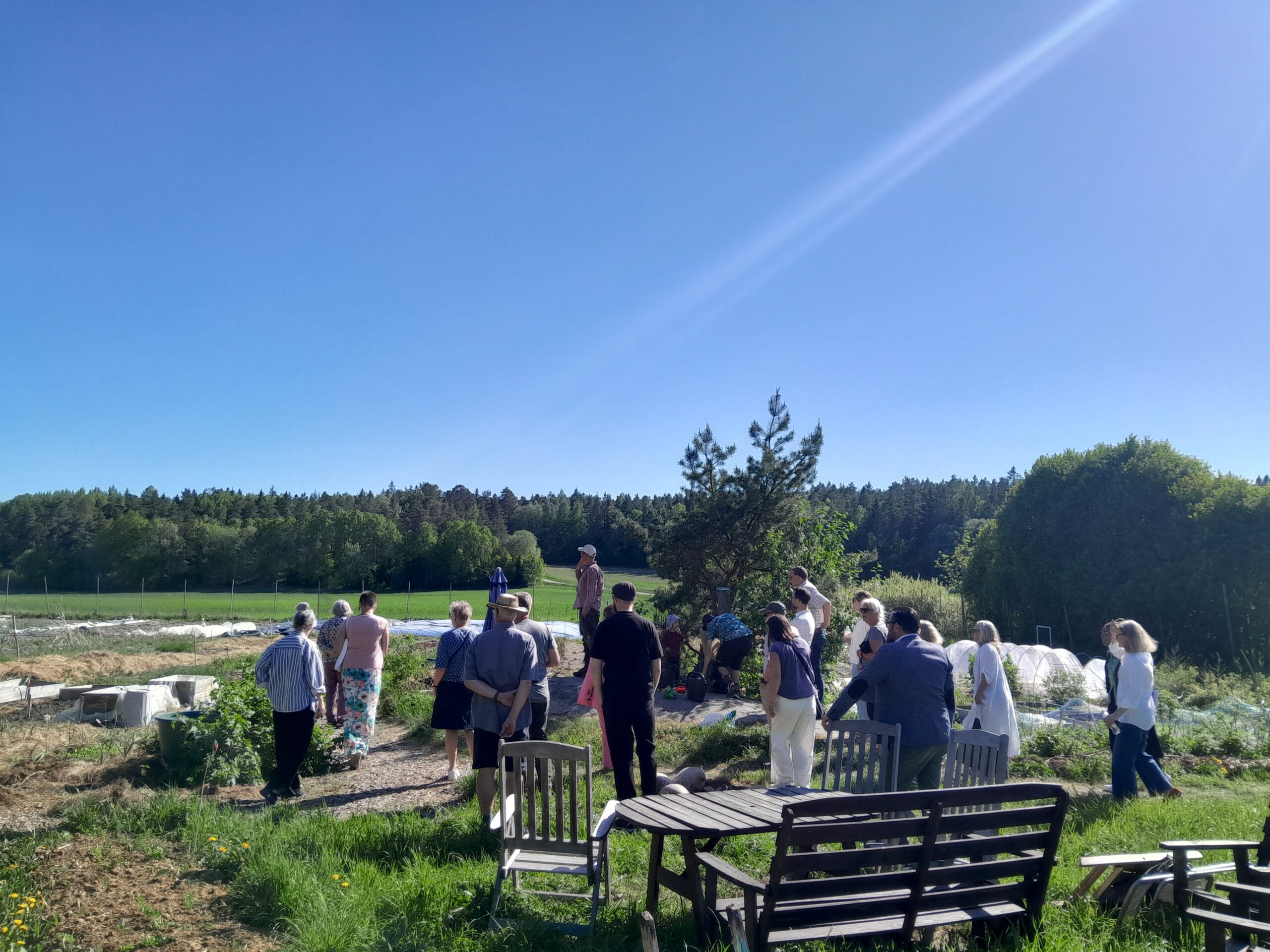 Mötet började med ett inspirerande studiebesök till platser som har vuxit fram tack vare Hågabys lokalbefolkningens engagemang och stöd från Upplandsbygd Skolträdgården i Hågaby är en lysande exempel på lyckad projekt som fortsätter att blomstra även efter projekttiden. Henrik Andersson är en av eldsjälarna bakom dessa initiativ som drivit idéerna och lyckats inspirera Hågas invånare att engagera sig och fortsätta ta steg mot ett mer resilient samhälle. Han bidrog till att Hågabor fick en gemensam knytpunkt och intresse att samlas kring, vilket gynnade många på olika sätt. Han berättade hur Skolträdgårdsprojektet har fungerat som en plats där barn i olika åldrar har kunnat lära sig om odling, matlagning, miljöutmaningar relaterade till vatten och övergödning, hälsa, beredskap och mycket mer. Nu är det Sofia, en engagerad förälder och pedagog, som tar hand om odlingen som en deltidstjänst för skolan. De berättar hur projektet började med ett tydligt produktionsfokus, där skolan under en säsong nästan kunde försörja köken med 100 % av grönsakerna. Men nu testar de olika odlingsarrangemang, att anpassa trädgården till klassernas pedagogiska plan och skapa en lekplats där de yngsta och mest nyfikna barnen kan utforska och samlas. Kombinationen av odling och pedagogik har gjort att det civila engagemanget är tillräckligt högt för att fortsätta utan projektpengar.